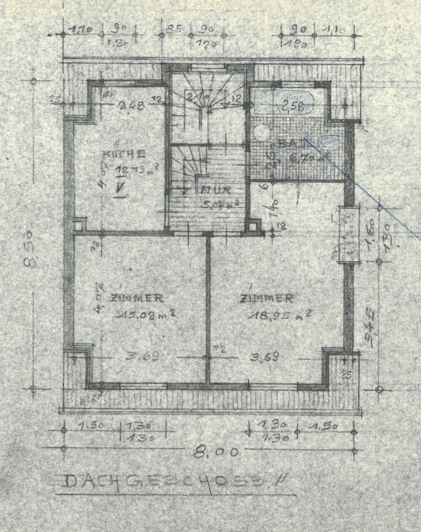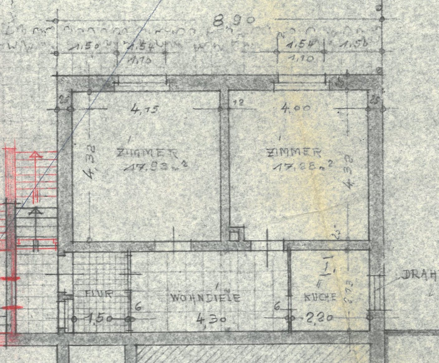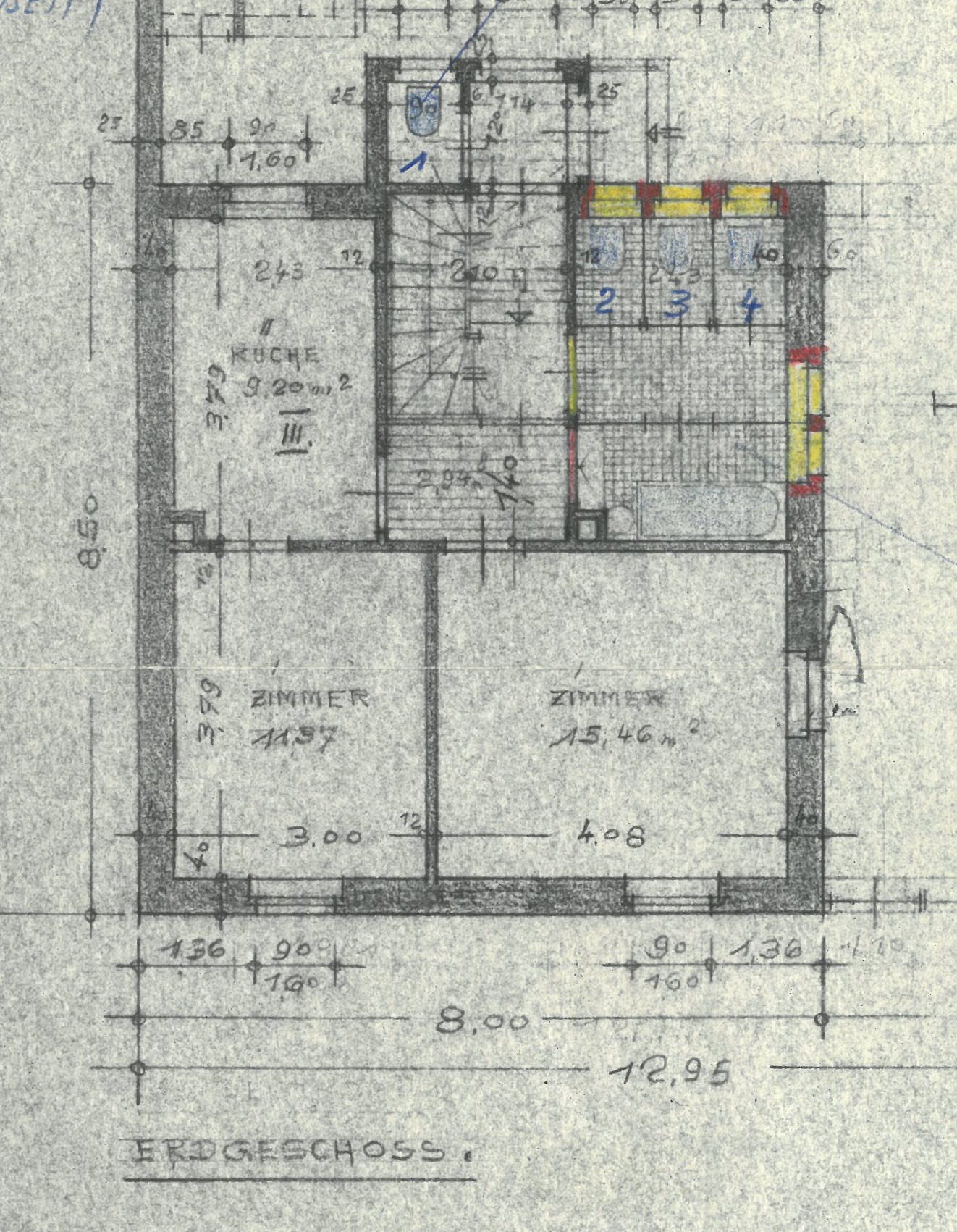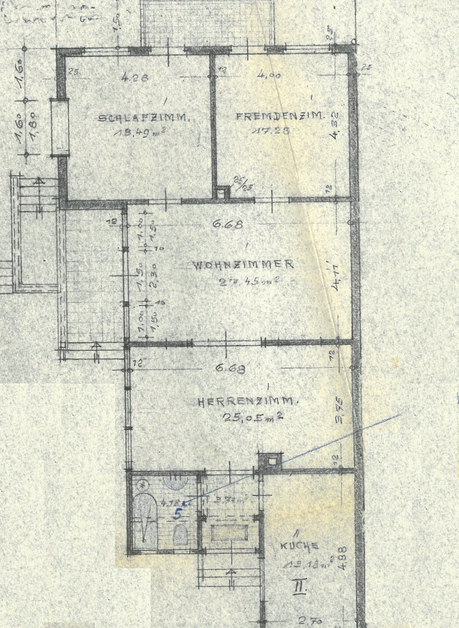 Das Gebäudeensemble, bestehend aus einem Mehrparteienhaus, gebaut 1938 und einem Bungalow aus 1959, beides in Massivbauweise, befindet auf einem Grundstück von ca. 513 m². Mit einer Wohnfläche von insgesamt ca. 311,2 m² bietet es Platz für insgesamt 13 Zimmer, darunter 6 Schlafzimmer und 4 Badezimmer. Der Bungalow verfügt zudem über einen Balkon sowie eine Ofenheizung, die in 2024 erneuert wurde. Das vordere Haus ist unterkellert und dem Bungalow sind zwei geräumige Vorratsräume im Außenbereich zugeordnet.