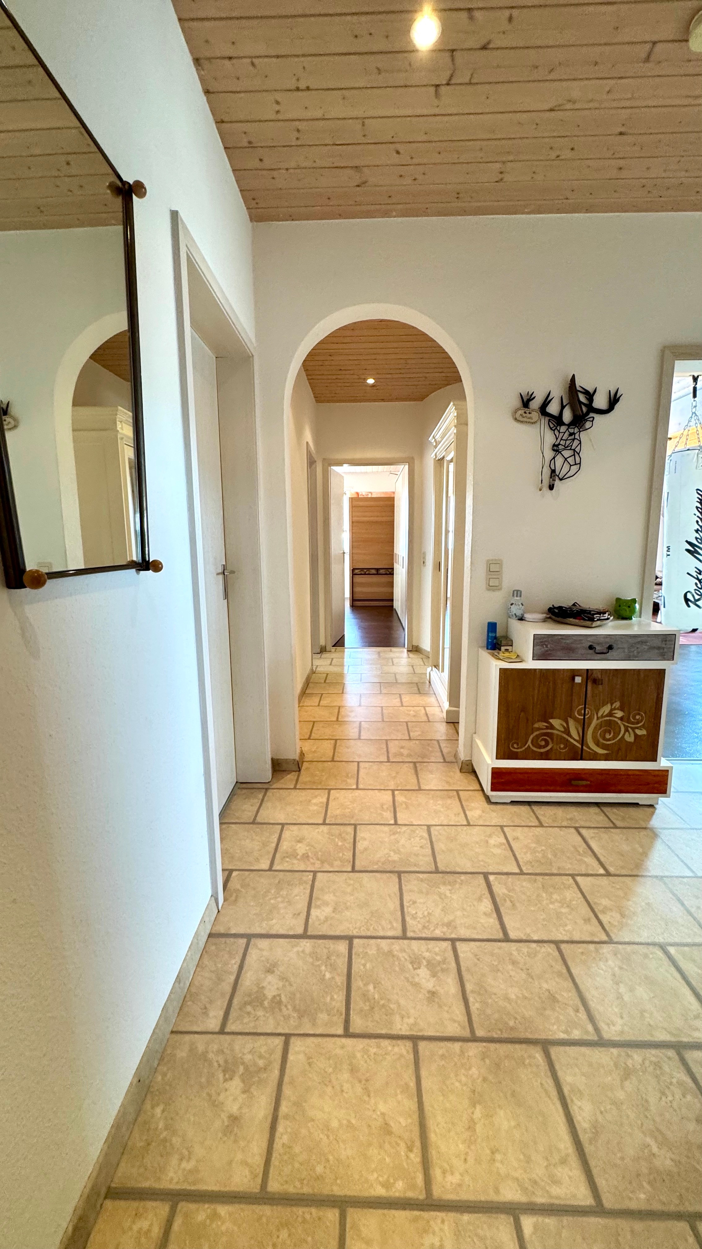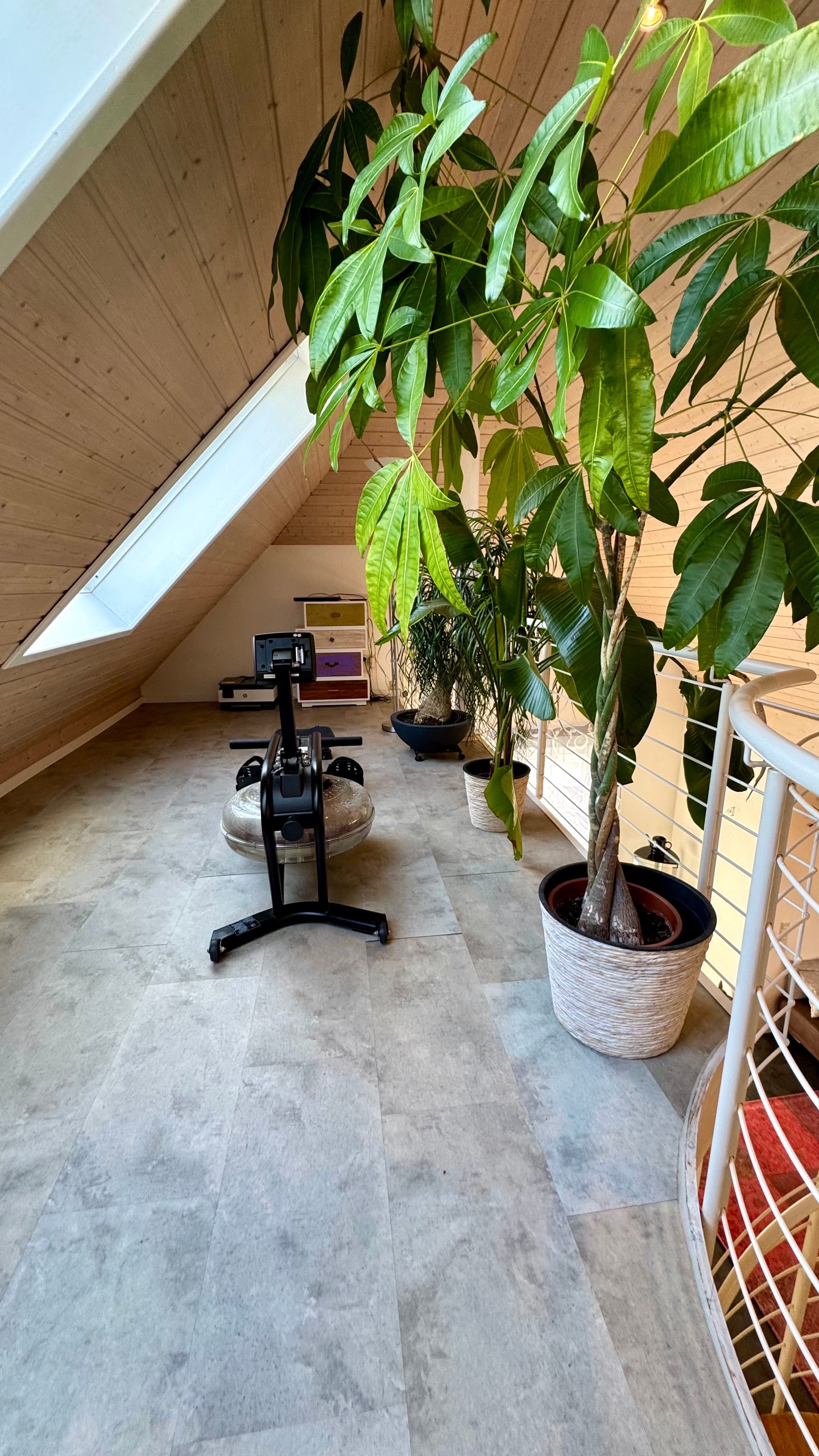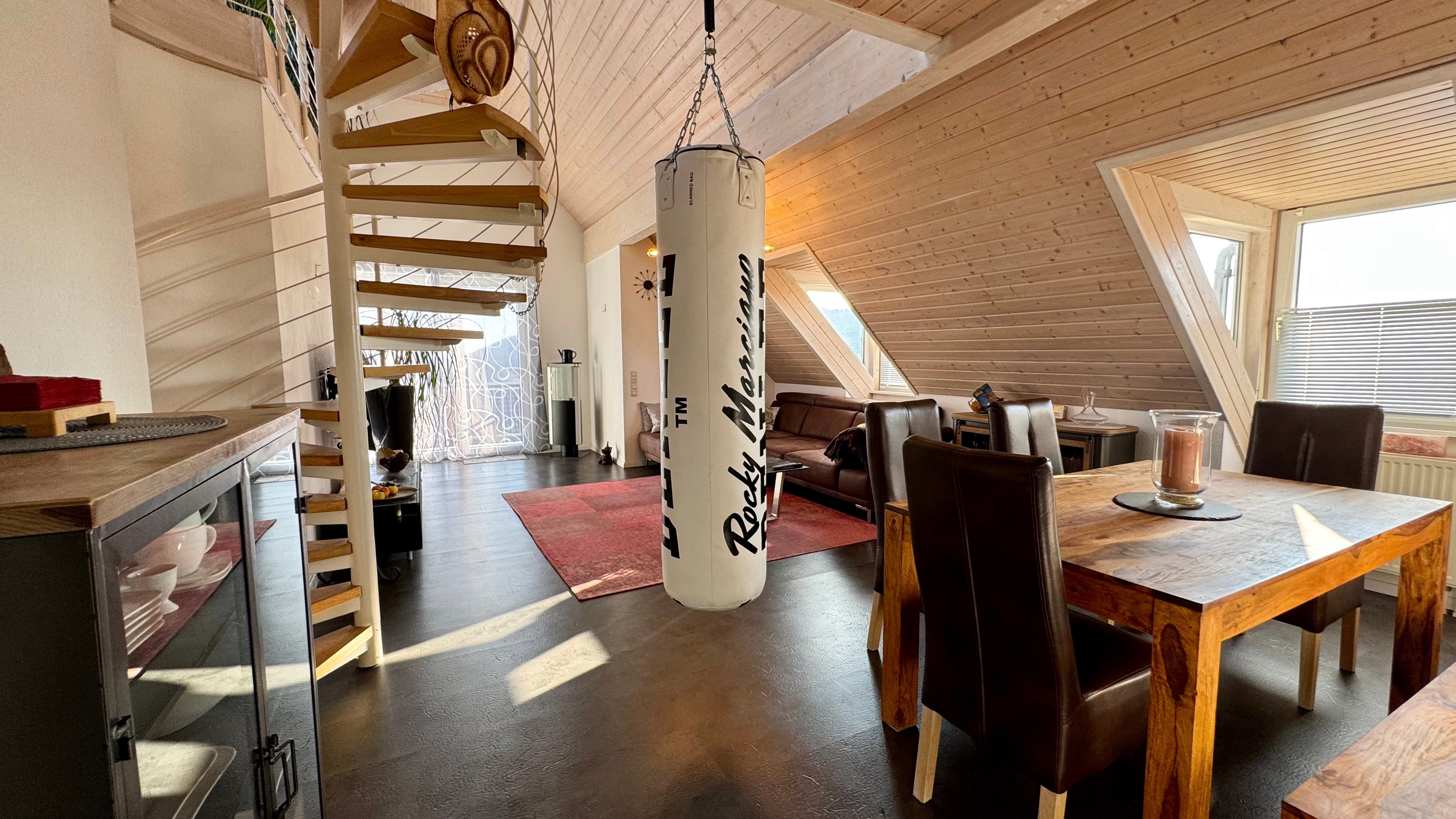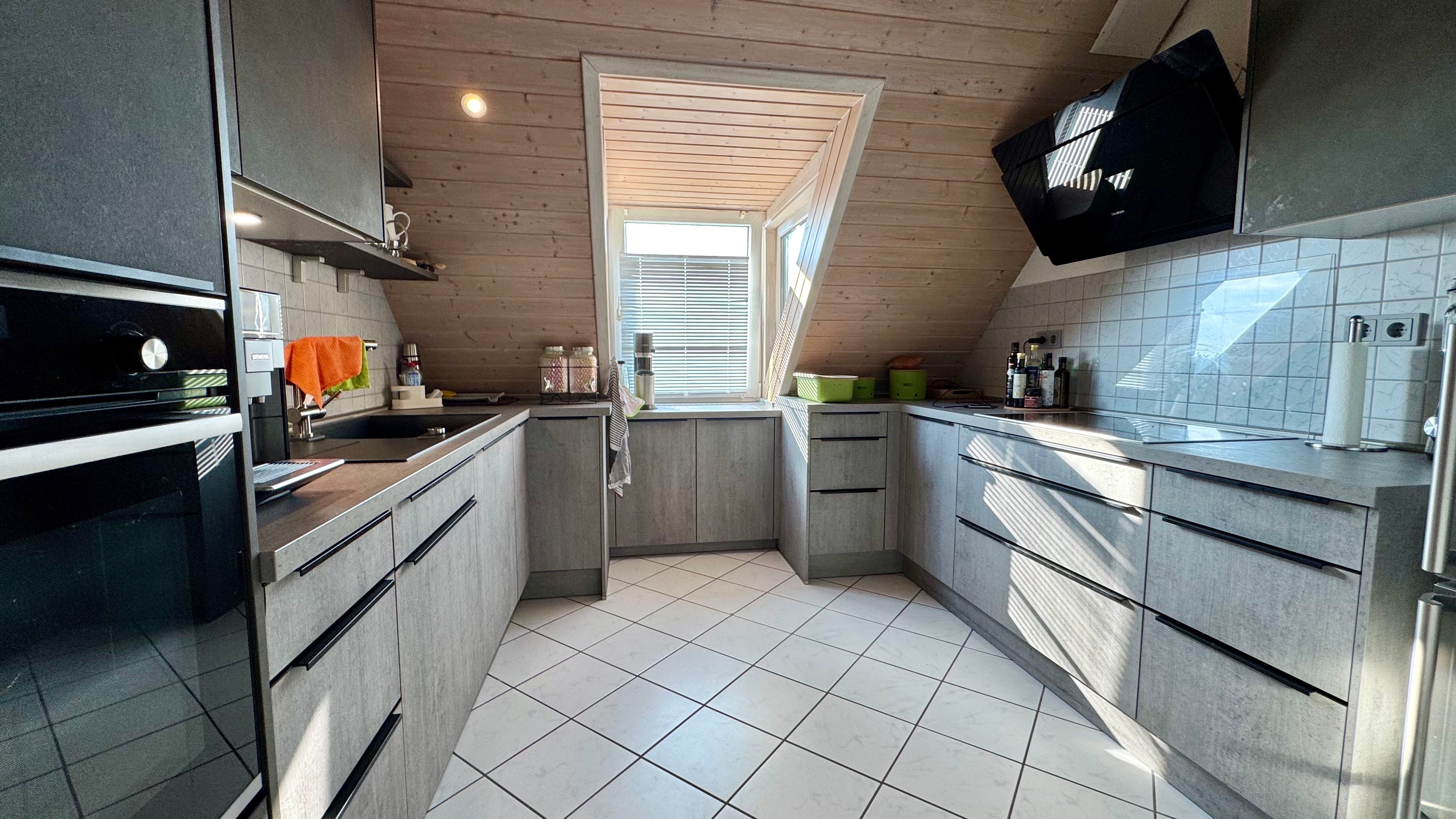 Großzügiger Wohn- und Essbereich mit offener Galerie, Dachstudio über Wendeltreppe erreichbar, Wendeltreppe mit Holzstufen und Metallgeländer, Vinylboden in schiefergrau, Korkboden im Schlafen sowie heller Fliesenboden in Küche, Bad und Flur, helle Holzdecken im gesamten Wohnbereich, helle Holztüren und Zargen, Dachflächenfenster für zusätzliche Belichtung, Tageslichtbad mit Badewanne und separater Dusche, separates Gäste-WC, Einbauspots in der gesamten Wohnung, Ölzentralheizung mit Warmwasserversorgung und Solarthermieanlage, weiße Heizkörper, moderne Einbauküche aus dem Jahr 2021, Glasfaseranschluss verfügbar, Kabelanschluss verhanden, Balkon mit Ausblick, große Einzelgarage, separater, abgeschlossener Kellerraum, allgemeine Waschküche im Gebäude