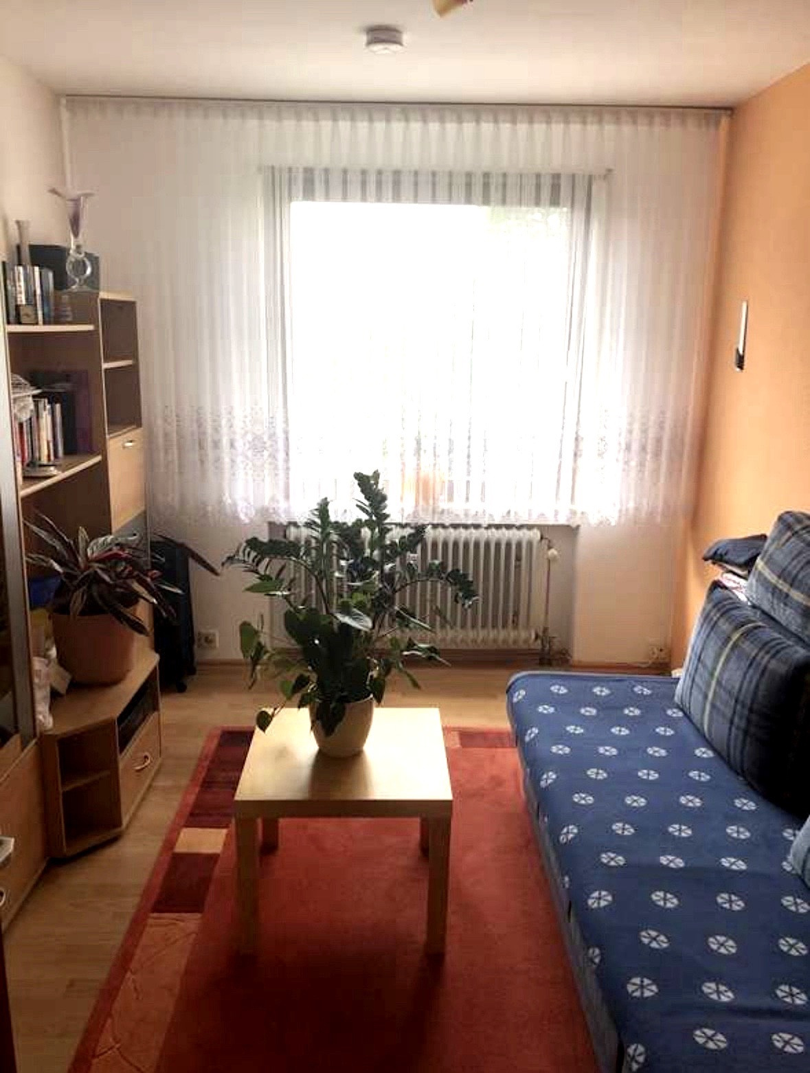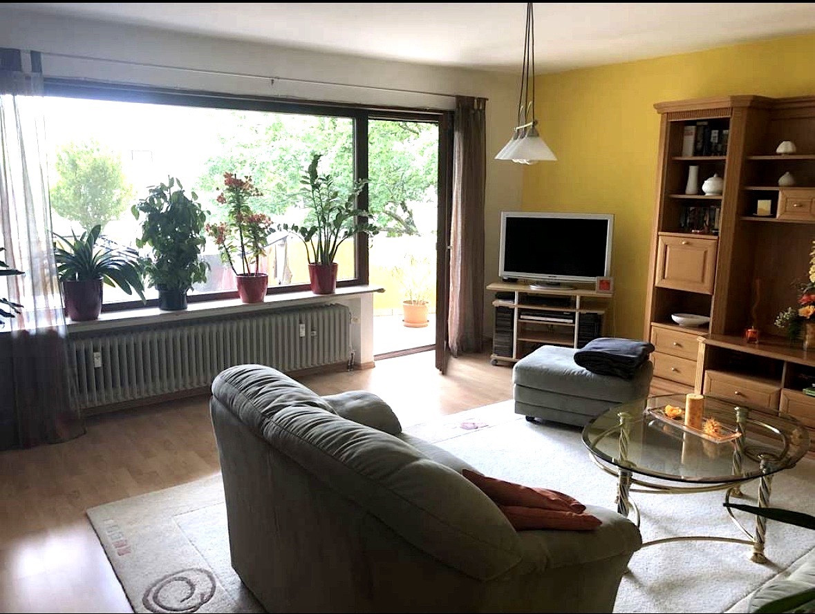 Das Herzstück der Wohnung bildet das geräumige Wohnzimmer mit großer Fensterfront und direktem Zugang zum Balkon. Hier genießen Sie nicht nur viel Tageslicht, sondern auch einen angenehmen Ausblick in die ruhige, grüne Umgebung – ideal zum Entspannen nach einem langen Tag.
